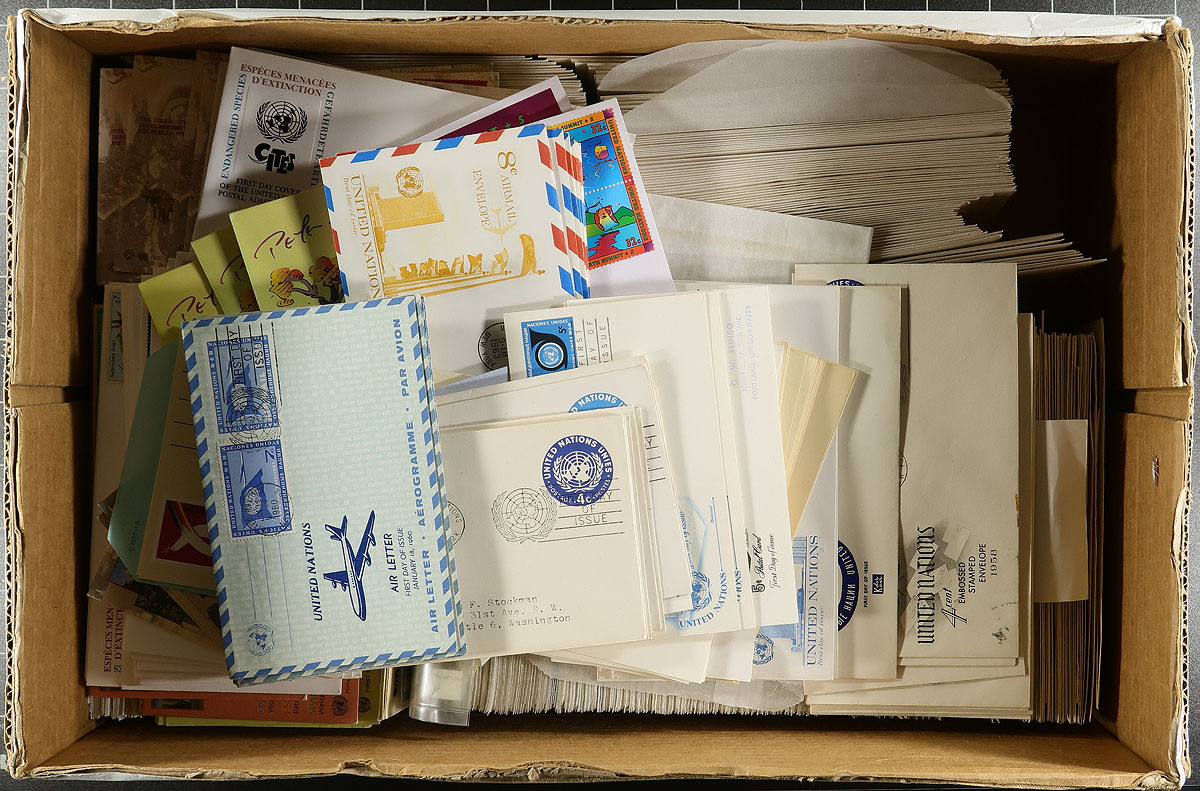 Nice group of roughly 600 first day covers, 1950's-1990's, noting singles, sets, blocks, plate blocks, and souvenir sheet frankings. A nice lot for cover collectors and thematic / topical specialists as we encountered several suitable subjects, and various cachets for some issues. Overall fine to very fine. Estimate =