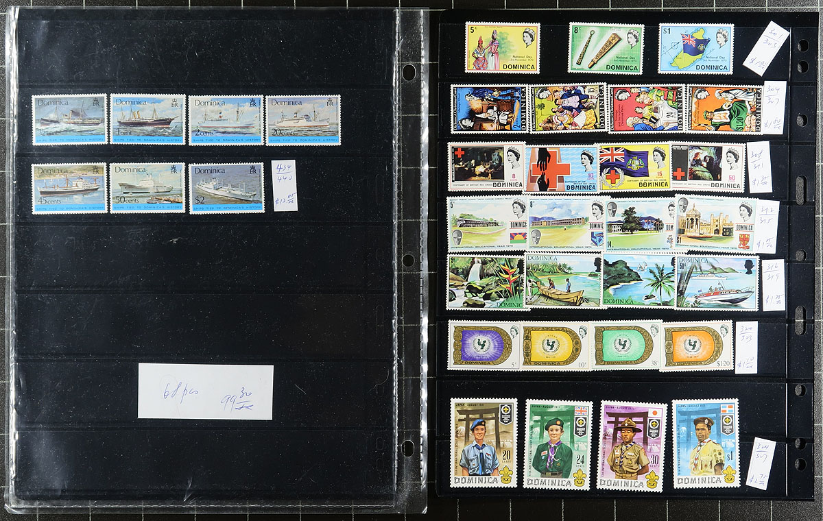 Clean accumulation of primarily never hinged worldwide stamps, containing many hundreds of issues in two stockbooks and a handful of stock pages. A cursory check indicated material generally ranging from the 1960's to the 1990's, with better representation from the British Commonwealth (including Dominica, Fiji, Egypt, and more), and European countries including France, Finland, and Germany. Most of the material has been catalogued by the owner using an older Scott catalogue totaling US$823.00, leaving better finds to the dedicated collector. A nice lor for the worldwide collector, overall fine to very fine. Estimate =