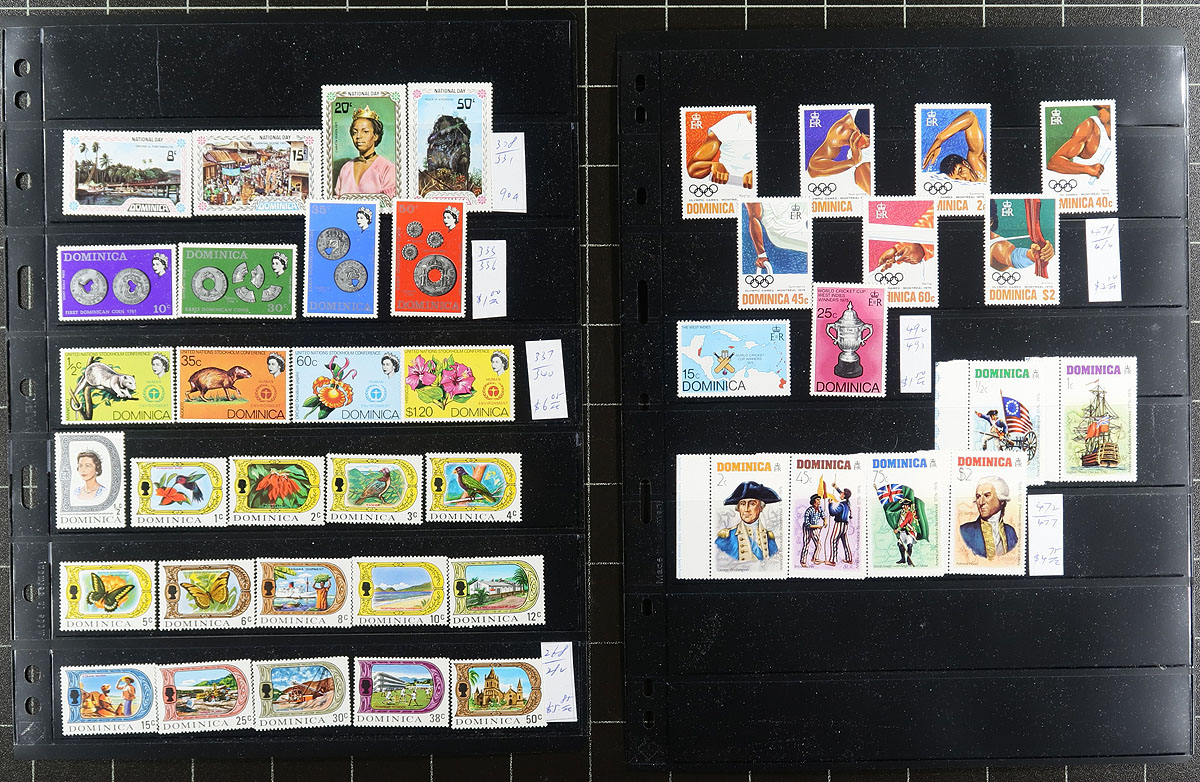 Clean accumulation of primarily never hinged worldwide stamps, containing many hundreds of issues in two stockbooks and a handful of stock pages. A cursory check indicated material generally ranging from the 1960's to the 1990's, with better representation from the British Commonwealth (including Dominica, Fiji, Egypt, and more), and European countries including France, Finland, and Germany. Most of the material has been catalogued by the owner using an older Scott catalogue totaling US$823.00, leaving better finds to the dedicated collector. A nice lor for the worldwide collector, overall fine to very fine. Estimate =