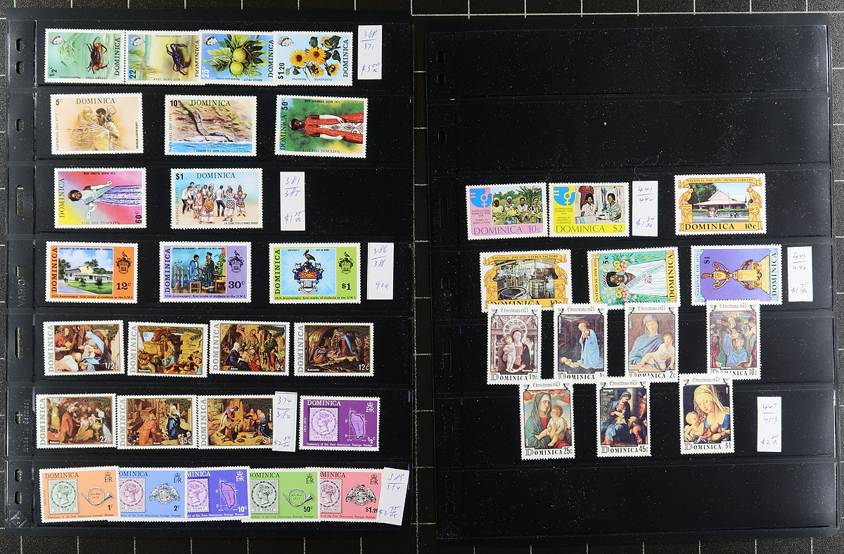 Clean accumulation of primarily never hinged worldwide stamps, containing many hundreds of issues in two stockbooks and a handful of stock pages. A cursory check indicated material generally ranging from the 1960's to the 1990's, with better representation from the British Commonwealth (including Dominica, Fiji, Egypt, and more), and European countries including France, Finland, and Germany. Most of the material has been catalogued by the owner using an older Scott catalogue totaling US$823.00, leaving better finds to the dedicated collector. A nice lor for the worldwide collector, overall fine to very fine. Estimate =