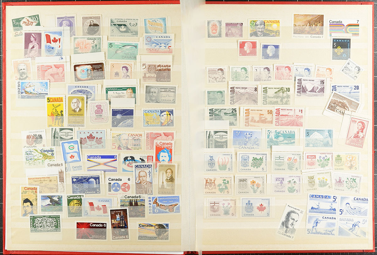 Clean accumulation of primarily never hinged worldwide stamps, containing many hundreds of issues in two stockbooks and a handful of stock pages. A cursory check indicated material generally ranging from the 1960's to the 1990's, with better representation from the British Commonwealth (including Dominica, Fiji, Egypt, and more), and European countries including France, Finland, and Germany. Most of the material has been catalogued by the owner using an older Scott catalogue totaling US$823.00, leaving better finds to the dedicated collector. A nice lor for the worldwide collector, overall fine to very fine. Estimate =