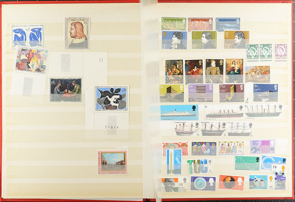Clean accumulation of primarily never hinged worldwide stamps, containing many hundreds of issues in two stockbooks and a handful of stock pages. A cursory check indicated material generally ranging from the 1960's to the 1990's, with better representation from the British Commonwealth (including Dominica, Fiji, Egypt, and more), and European countries including France, Finland, and Germany. Most of the material has been catalogued by the owner using an older Scott catalogue totaling US$823.00, leaving better finds to the dedicated collector. A nice lor for the worldwide collector, overall fine to very fine. Estimate =