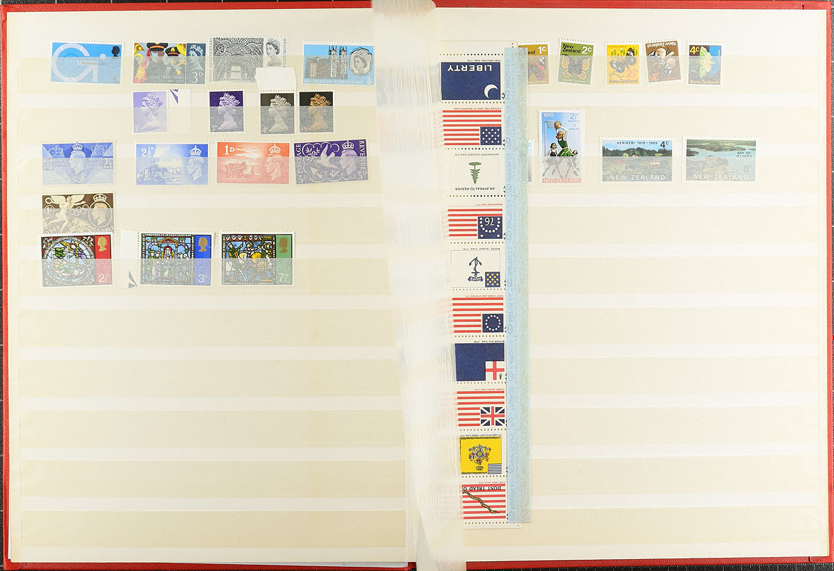 Clean accumulation of primarily never hinged worldwide stamps, containing many hundreds of issues in two stockbooks and a handful of stock pages. A cursory check indicated material generally ranging from the 1960's to the 1990's, with better representation from the British Commonwealth (including Dominica, Fiji, Egypt, and more), and European countries including France, Finland, and Germany. Most of the material has been catalogued by the owner using an older Scott catalogue totaling US$823.00, leaving better finds to the dedicated collector. A nice lor for the worldwide collector, overall fine to very fine. Estimate =