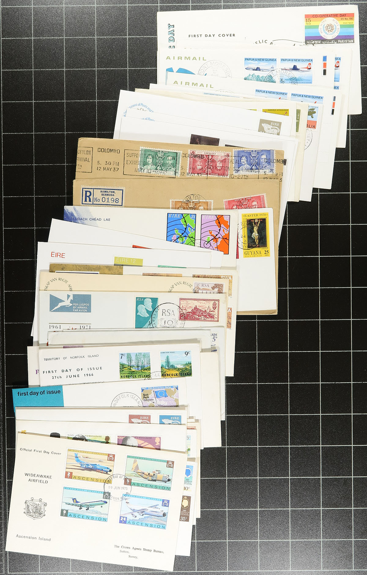 British Commonwealth Covers. Nice group of roughly 250 covers, 1960's-1980's, almost all appearing to be first day covers with singles, sets, and a few souvenir sheet frankings. We note better representation from Oceania, West Indies, and British Africa, along with a few other regions. A nice group for collectors and dealers alike, a few small bends on a few covers, overall fine to very fine. Estimate =