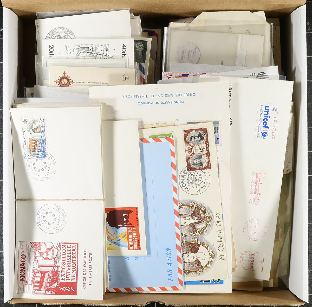 Attractive group of roughly 200 worldwide covers, 1910's-1970's, with a decent variety of items including military mail (various censor tapes), first day covers, postal stationery, commercial mail (noting airmail and registered rates), commemorative covers, and more. A cursory check indicated better representation from European countries (especially Monaco), along with some Asia and other regions. A few of the items have been sleeved and priced in the $2 to $5 range. A nice group for collectors and for dealers to add to dollar boxes. A few small faults with a few of the covers, overall fine to very fine. Estimate =