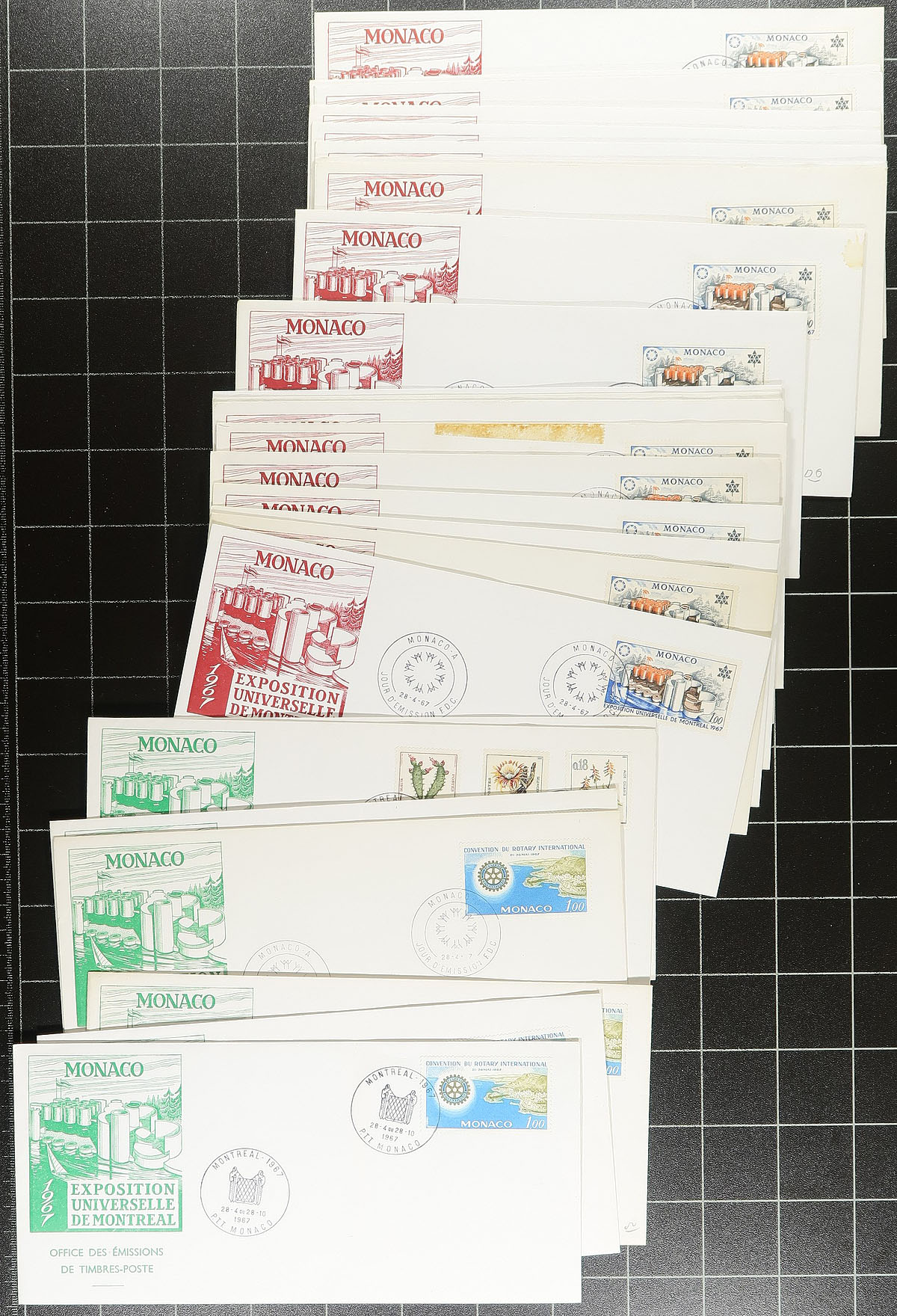Attractive group of roughly 200 worldwide covers, 1910's-1970's, with a decent variety of items including military mail (various censor tapes), first day covers, postal stationery, commercial mail (noting airmail and registered rates), commemorative covers, and more. A cursory check indicated better representation from European countries (especially Monaco), along with some Asia and other regions. A few of the items have been sleeved and priced in the $2 to $5 range. A nice group for collectors and for dealers to add to dollar boxes. A few small faults with a few of the covers, overall fine to very fine. Estimate =