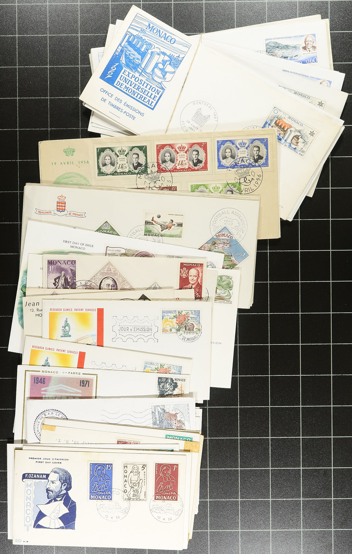 Attractive group of roughly 200 worldwide covers, 1910's-1970's, with a decent variety of items including military mail (various censor tapes), first day covers, postal stationery, commercial mail (noting airmail and registered rates), commemorative covers, and more. A cursory check indicated better representation from European countries (especially Monaco), along with some Asia and other regions. A few of the items have been sleeved and priced in the $2 to $5 range. A nice group for collectors and for dealers to add to dollar boxes. A few small faults with a few of the covers, overall fine to very fine. Estimate =