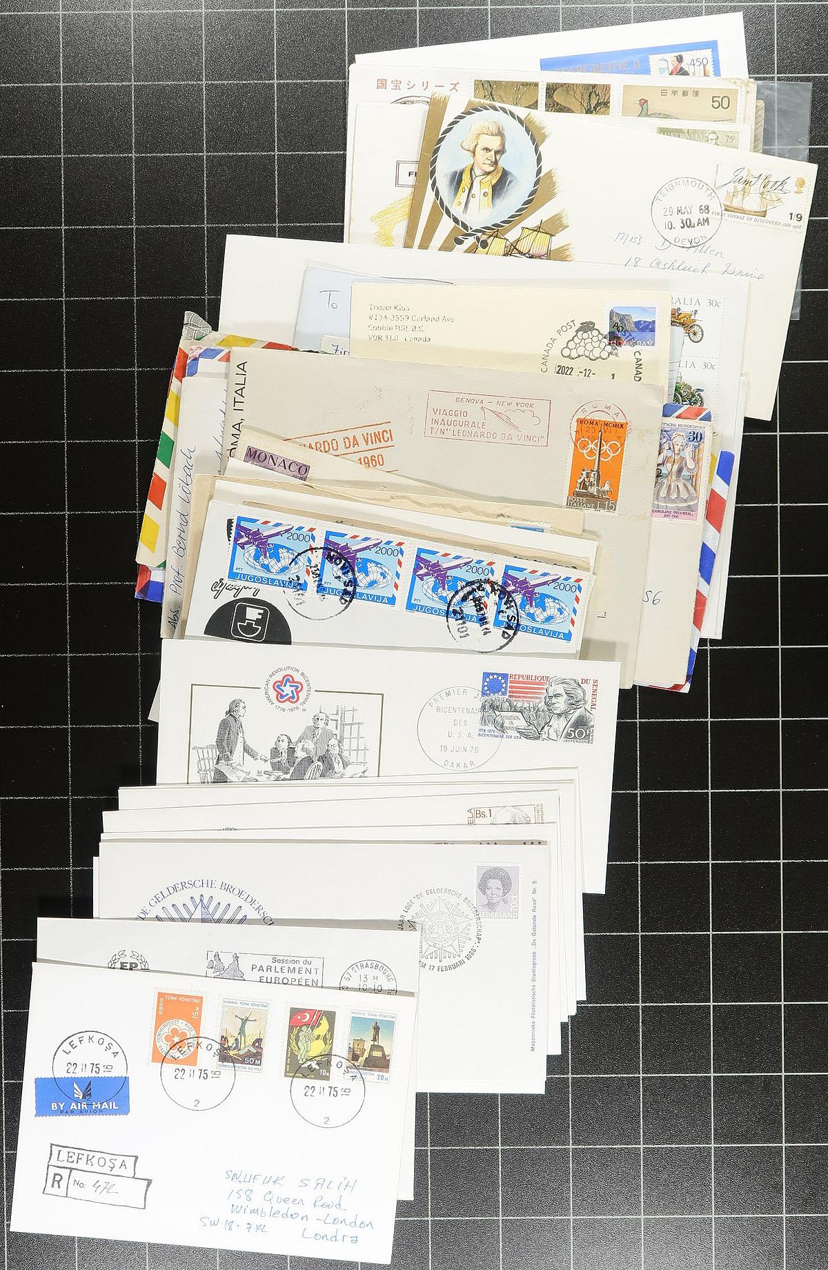Attractive group of roughly 200 worldwide covers, 1910's-1970's, with a decent variety of items including military mail (various censor tapes), first day covers, postal stationery, commercial mail (noting airmail and registered rates), commemorative covers, and more. A cursory check indicated better representation from European countries (especially Monaco), along with some Asia and other regions. A few of the items have been sleeved and priced in the $2 to $5 range. A nice group for collectors and for dealers to add to dollar boxes. A few small faults with a few of the covers, overall fine to very fine. Estimate =
