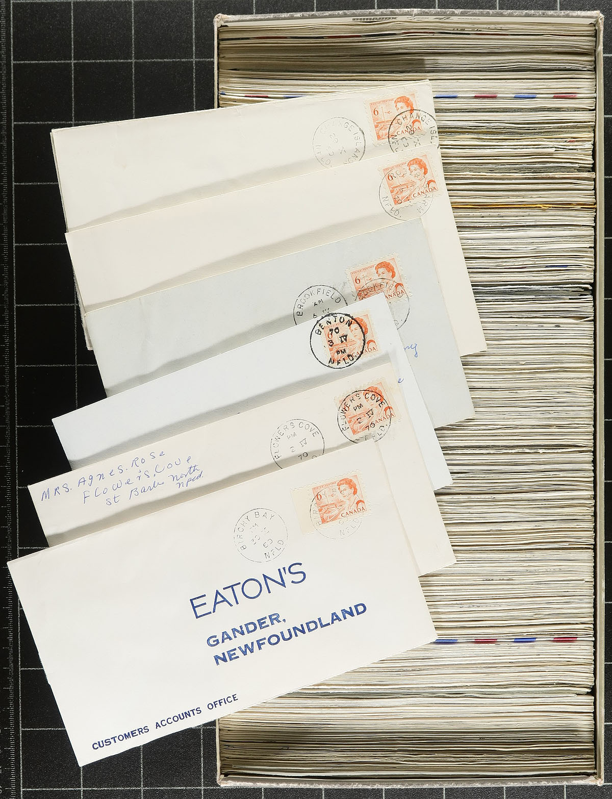 Newfoundland Postmarks. Accumulation of roughly 500 covers collected for Newfoundland town cancels, 1969-1970, all franked with 6c orange Centennial stamps. We estimated roughly 50 to 75 different towns ranging from A to W including Robert's Arm, Stag Harbour, Change Islands, Birchy Bay, Flowers Cove, Brookfield, Benton, and other colourful town names. A nice lot for Centennial or postmark collectors. Estimate =