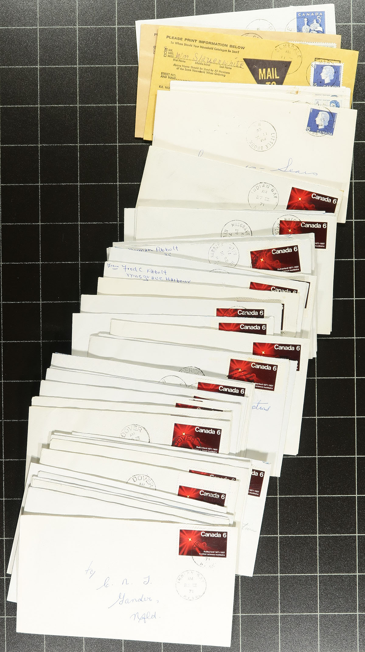 Maritime Postmarks. Group of roughly 400 covers collected for Maritime town postmarks, 1960's-1980's, with better representation from Nova Scotia and Newfoundland, with a few from New Brunswick and Prince Edward Island. We estimate over 100 different towns, many having corner card advertising, with a variety of frankings and postmark types including cds, split ring, duplex, slogan, MOON, and a few other types. Some towns have a variety of either frankings or postmark types. A nice lot for the Canada postmark collector. Estimate =