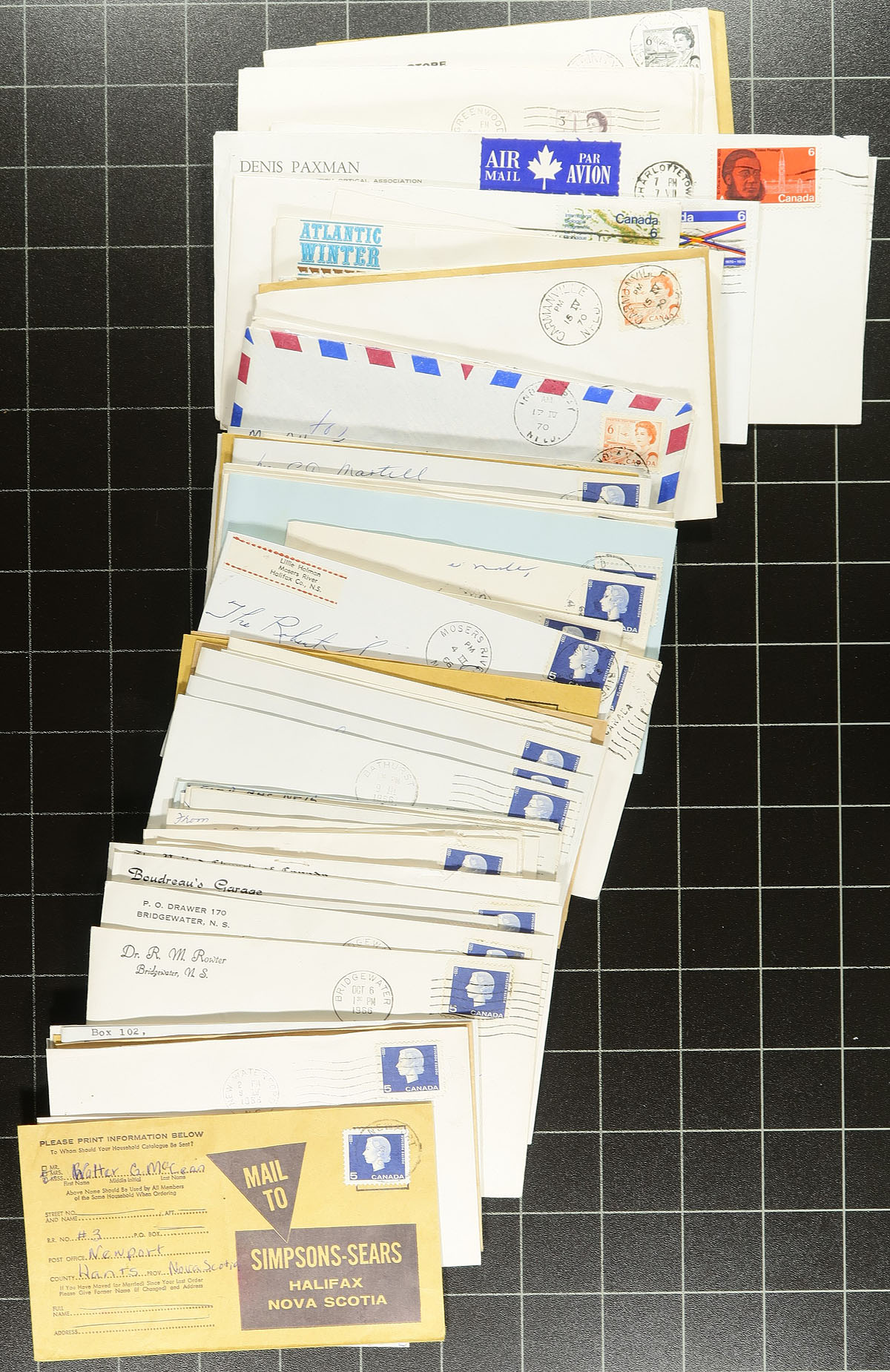 Maritime Postmarks. Group of roughly 400 covers collected for Maritime town postmarks, 1960's-1980's, with better representation from Nova Scotia and Newfoundland, with a few from New Brunswick and Prince Edward Island. We estimate over 100 different towns, many having corner card advertising, with a variety of frankings and postmark types including cds, split ring, duplex, slogan, MOON, and a few other types. Some towns have a variety of either frankings or postmark types. A nice lot for the Canada postmark collector. Estimate =