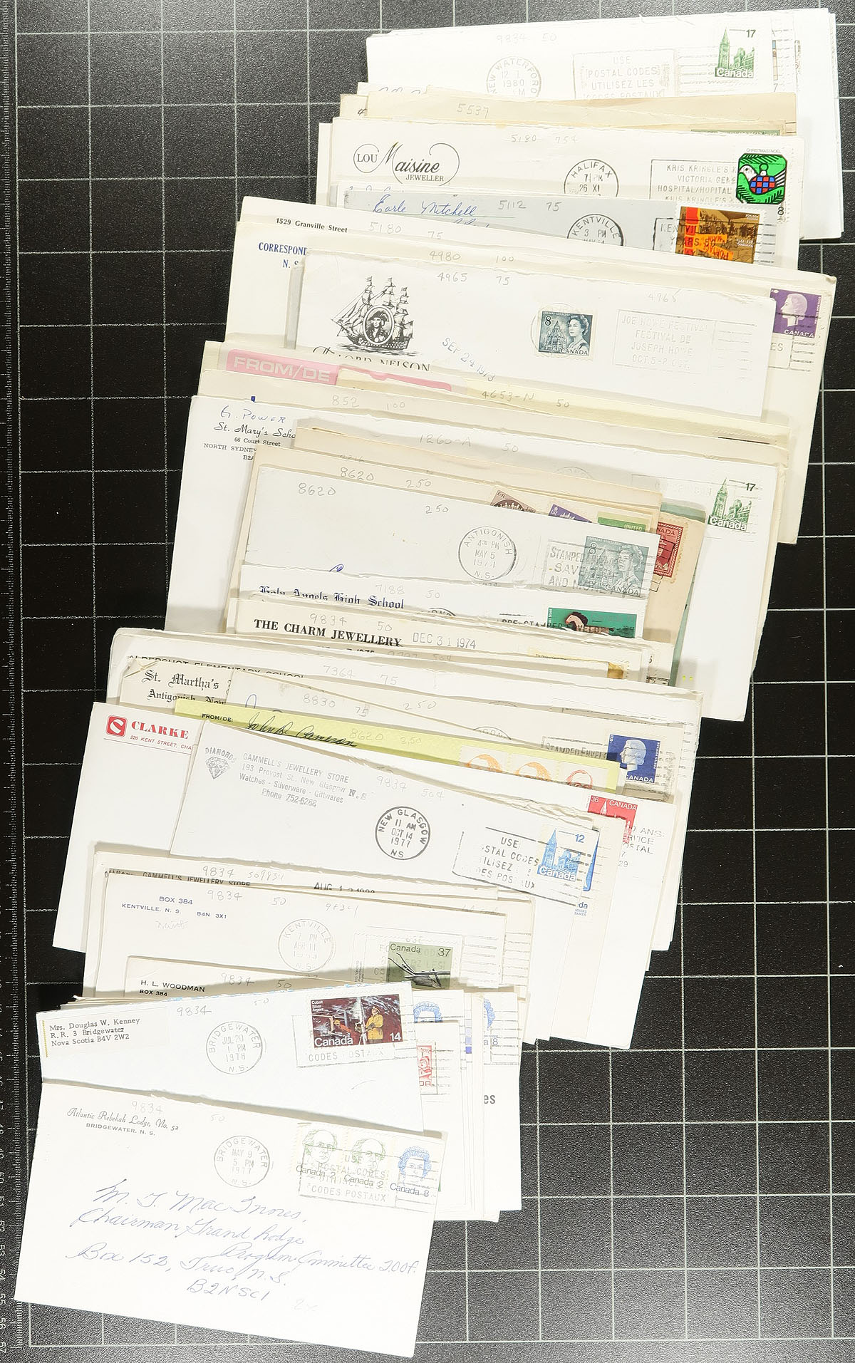 Maritime Postmarks. Group of roughly 400 covers collected for Maritime town postmarks, 1960's-1980's, with better representation from Nova Scotia and Newfoundland, with a few from New Brunswick and Prince Edward Island. We estimate over 100 different towns, many having corner card advertising, with a variety of frankings and postmark types including cds, split ring, duplex, slogan, MOON, and a few other types. Some towns have a variety of either frankings or postmark types. A nice lot for the Canada postmark collector. Estimate =