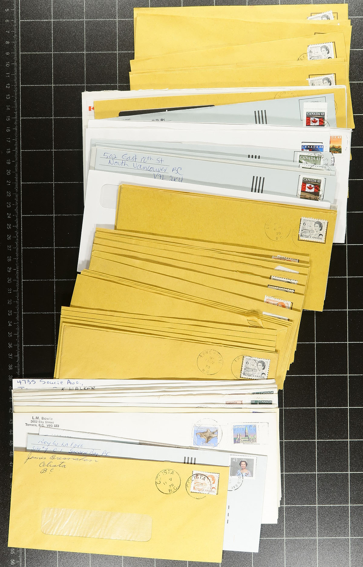 British Columbia Postal History. Accumulation of roughly 750 covers collected for British Columbia town cancels, 1960's-2000's, with roughly 100 different towns generally ranging from A to L including Garden Bay, Hixon, Heriot Bay, Hedley, Celista, and more. We note some heavy duplication for some towns, some having a variety of frankings and postmark types noting cds, Klussendorf, machine, slogan, POCONS, and perhaps a few other types. A nice general lot of British Columbia town postmarks. Estimate =