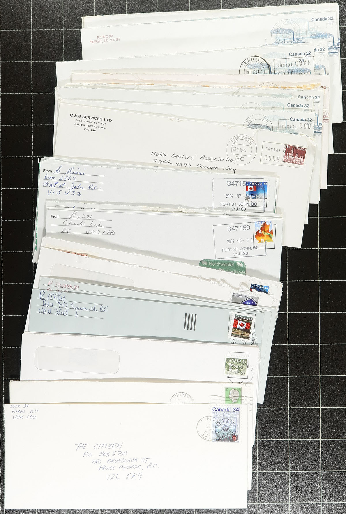 British Columbia Postal History. Accumulation of roughly 750 covers collected for British Columbia town cancels, 1960's-2000's, with roughly 100 different towns generally ranging from A to L including Garden Bay, Hixon, Heriot Bay, Hedley, Celista, and more. We note some heavy duplication for some towns, some having a variety of frankings and postmark types noting cds, Klussendorf, machine, slogan, POCONS, and perhaps a few other types. A nice general lot of British Columbia town postmarks. Estimate =