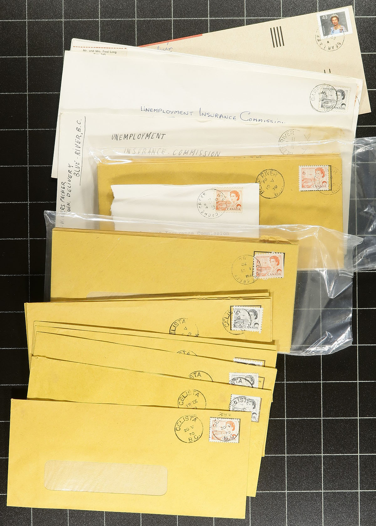 British Columbia Postal History. Accumulation of roughly 750 covers collected for British Columbia town cancels, 1960's-2000's, with roughly 100 different towns generally ranging from A to L including Garden Bay, Hixon, Heriot Bay, Hedley, Celista, and more. We note some heavy duplication for some towns, some having a variety of frankings and postmark types noting cds, Klussendorf, machine, slogan, POCONS, and perhaps a few other types. A nice general lot of British Columbia town postmarks. Estimate =