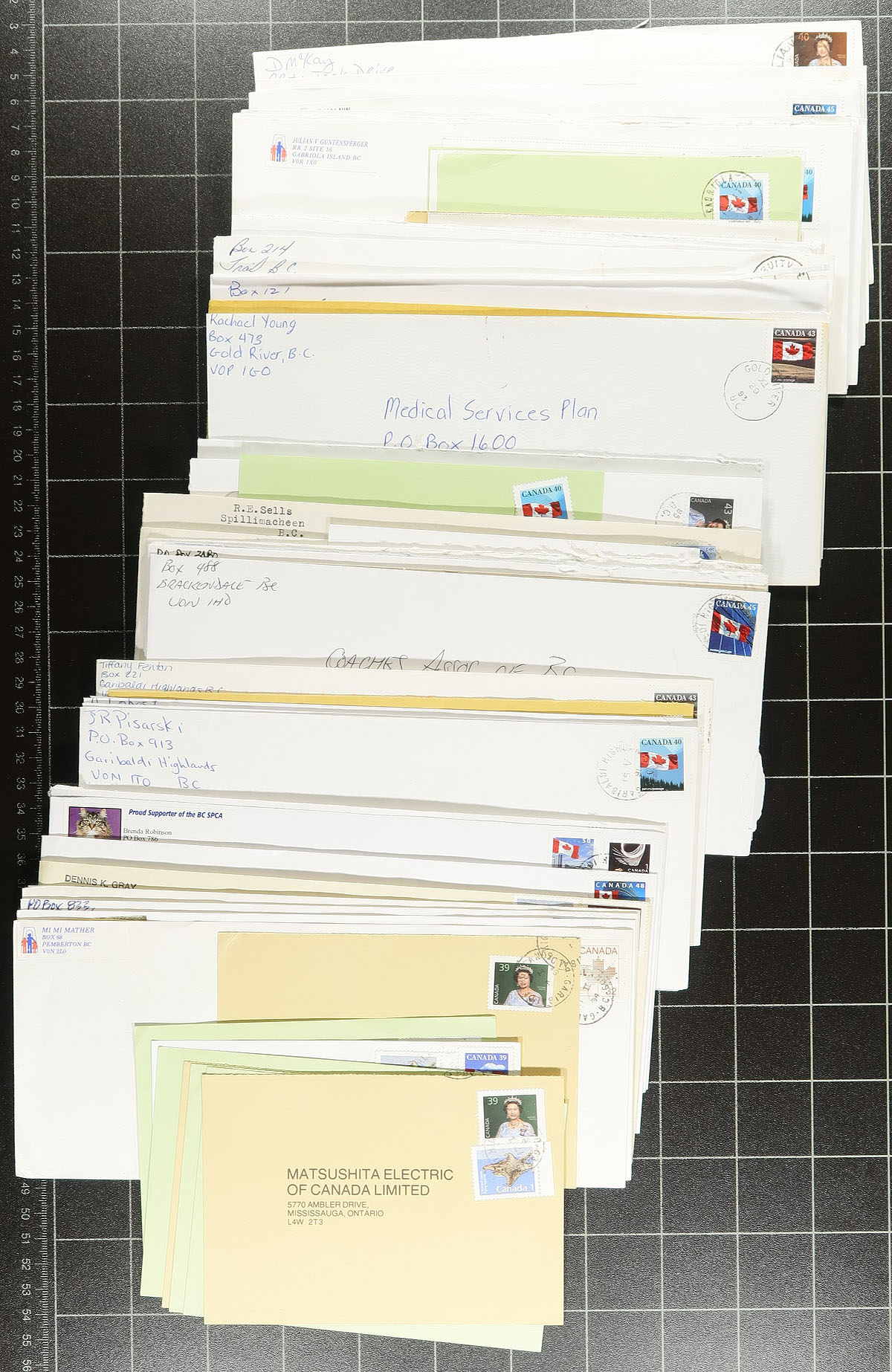 British Columbia Postal History. Accumulation of roughly 750 covers collected for British Columbia town cancels, 1960's-2000's, with roughly 100 different towns generally ranging from A to L including Garden Bay, Hixon, Heriot Bay, Hedley, Celista, and more. We note some heavy duplication for some towns, some having a variety of frankings and postmark types noting cds, Klussendorf, machine, slogan, POCONS, and perhaps a few other types. A nice general lot of British Columbia town postmarks. Estimate =