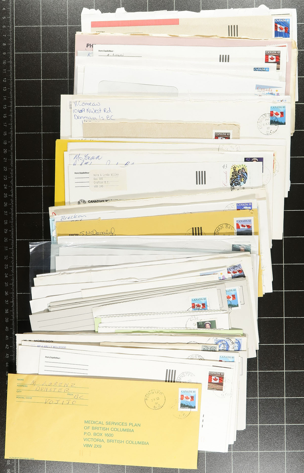 British Columbia Postal History. Accumulation of roughly 750 covers collected for British Columbia town cancels, 1960's-2000's, with roughly 100 different towns generally ranging from A to L including Garden Bay, Hixon, Heriot Bay, Hedley, Celista, and more. We note some heavy duplication for some towns, some having a variety of frankings and postmark types noting cds, Klussendorf, machine, slogan, POCONS, and perhaps a few other types. A nice general lot of British Columbia town postmarks. Estimate =