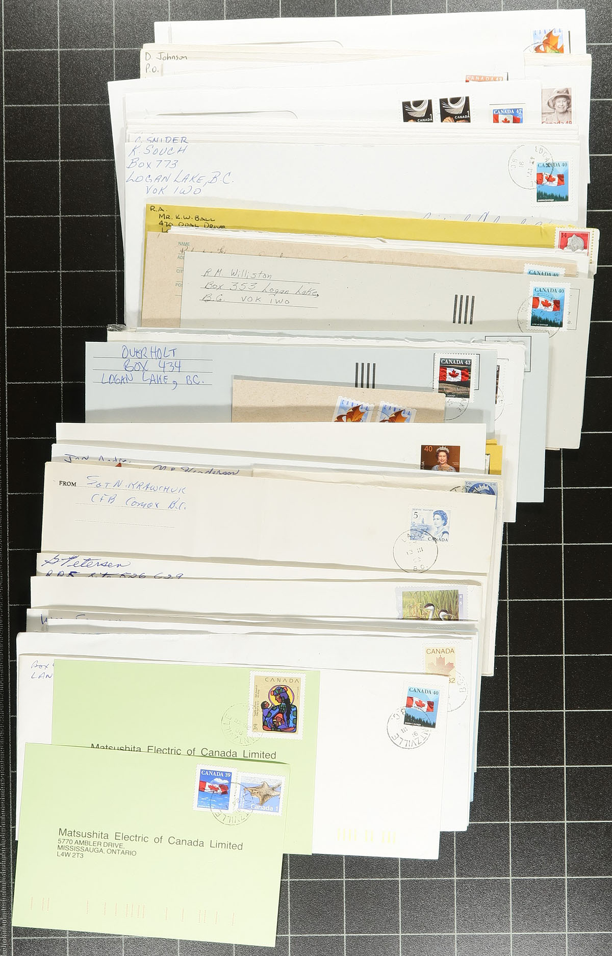 British Columbia Postal History. Accumulation of roughly 750 covers collected for British Columbia town cancels, 1960's-2000's, with roughly 100 different towns generally ranging from A to L including Garden Bay, Hixon, Heriot Bay, Hedley, Celista, and more. We note some heavy duplication for some towns, some having a variety of frankings and postmark types noting cds, Klussendorf, machine, slogan, POCONS, and perhaps a few other types. A nice general lot of British Columbia town postmarks. Estimate =