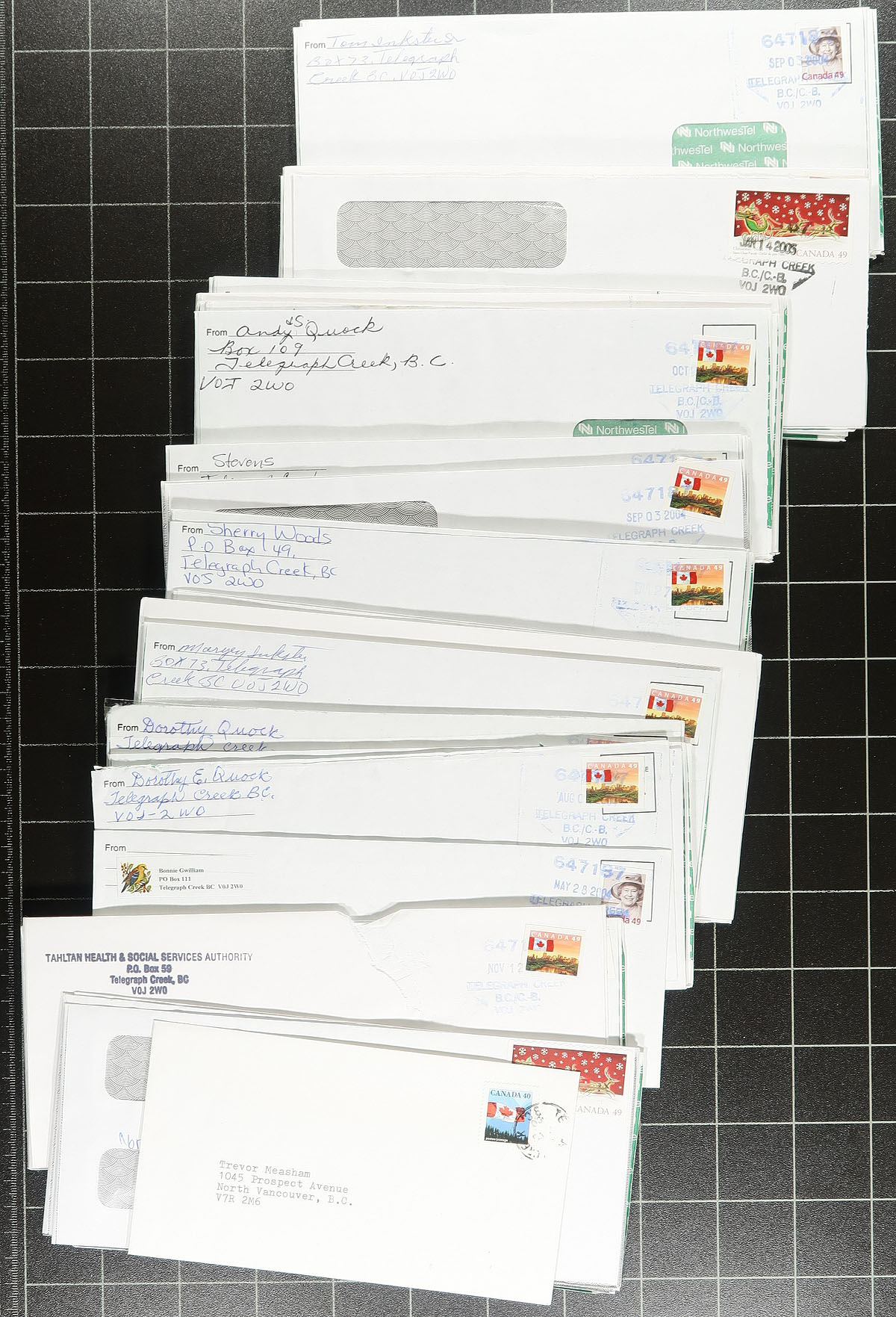 British Columbia Postal History. Accumulation of roughly 750 covers collected for British Columbia town cancels, 1960's-2000's, with roughly 100 different towns generally ranging from A to L including Garden Bay, Hixon, Heriot Bay, Hedley, Celista, and more. We note some heavy duplication for some towns, some having a variety of frankings and postmark types noting cds, Klussendorf, machine, slogan, POCONS, and perhaps a few other types. A nice general lot of British Columbia town postmarks. Estimate =