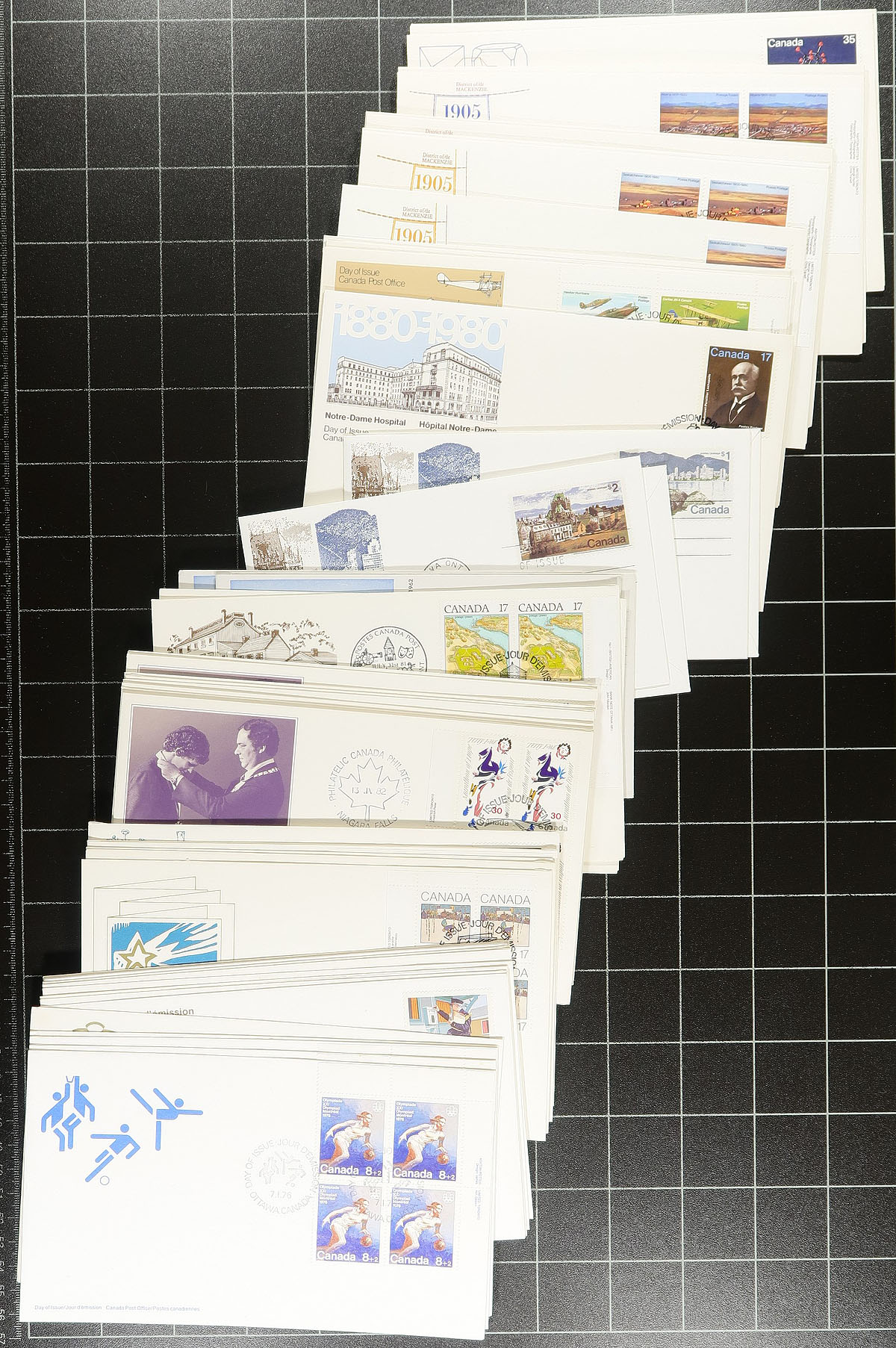 First Day Covers. Accumulation of roughly 750 first day covers in a bankers box, 1960's-1980's, noting singles, sets, plate blocks, souvenir sheet, and high denomination frankings. The lot includes some non cachet covers from the 1960's, with duplication up to 3 for some issues. A nice clean lot for all collectors. Estimate =