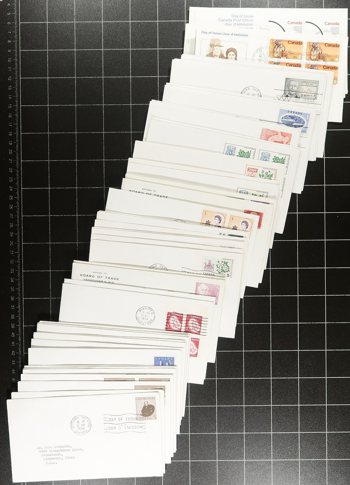 First Day Covers. Accumulation of roughly 750 first day covers in a bankers box, 1960's-1980's, noting singles, sets, plate blocks, souvenir sheet, and high denomination frankings. The lot includes some non cachet covers from the 1960's, with duplication up to 3 for some issues. A nice clean lot for all collectors. Estimate =