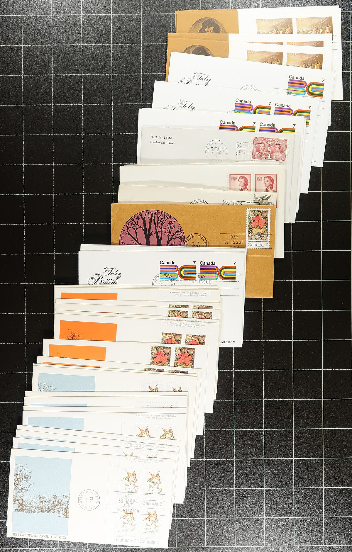 First Day Covers. Accumulation of roughly 750 first day covers in a bankers box, 1960's-1980's, noting singles, sets, plate blocks, souvenir sheet, and high denomination frankings. The lot includes some non cachet covers from the 1960's, with duplication up to 3 for some issues. A nice clean lot for all collectors. Estimate =
