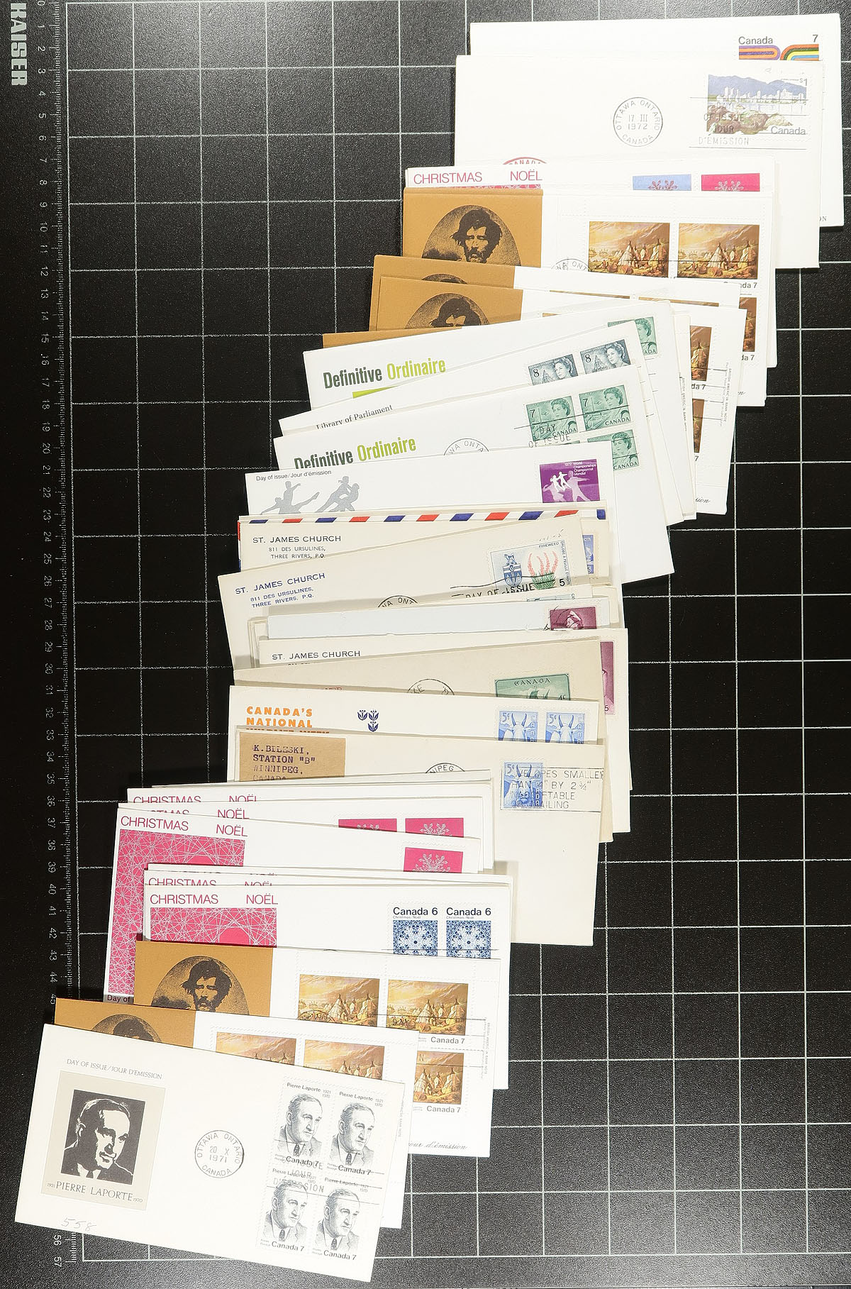 First Day Covers. Accumulation of roughly 750 first day covers in a bankers box, 1960's-1980's, noting singles, sets, plate blocks, souvenir sheet, and high denomination frankings. The lot includes some non cachet covers from the 1960's, with duplication up to 3 for some issues. A nice clean lot for all collectors. Estimate =