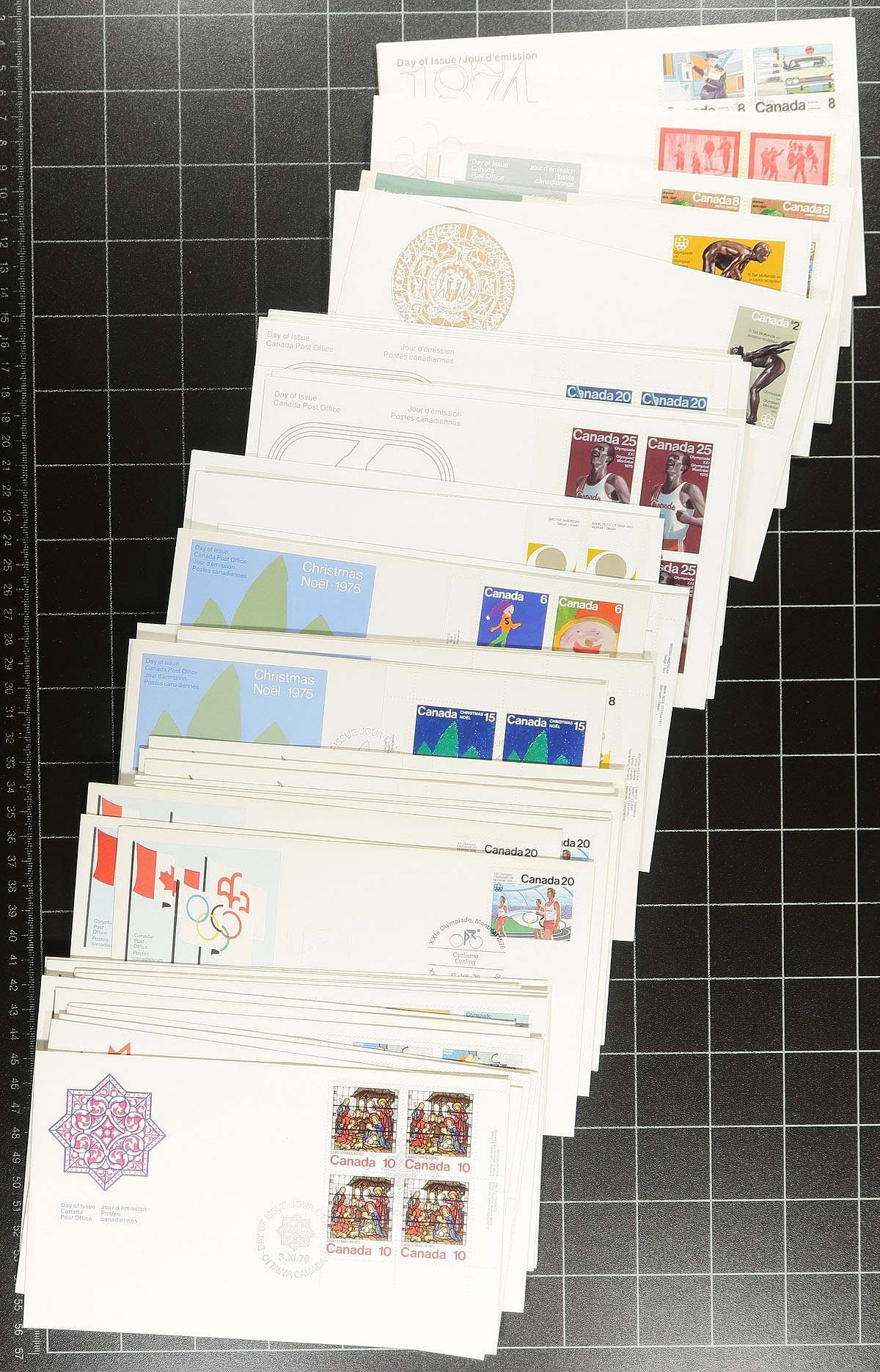 First Day Covers. Accumulation of roughly 750 first day covers in a bankers box, 1960's-1980's, noting singles, sets, plate blocks, souvenir sheet, and high denomination frankings. The lot includes some non cachet covers from the 1960's, with duplication up to 3 for some issues. A nice clean lot for all collectors. Estimate =
