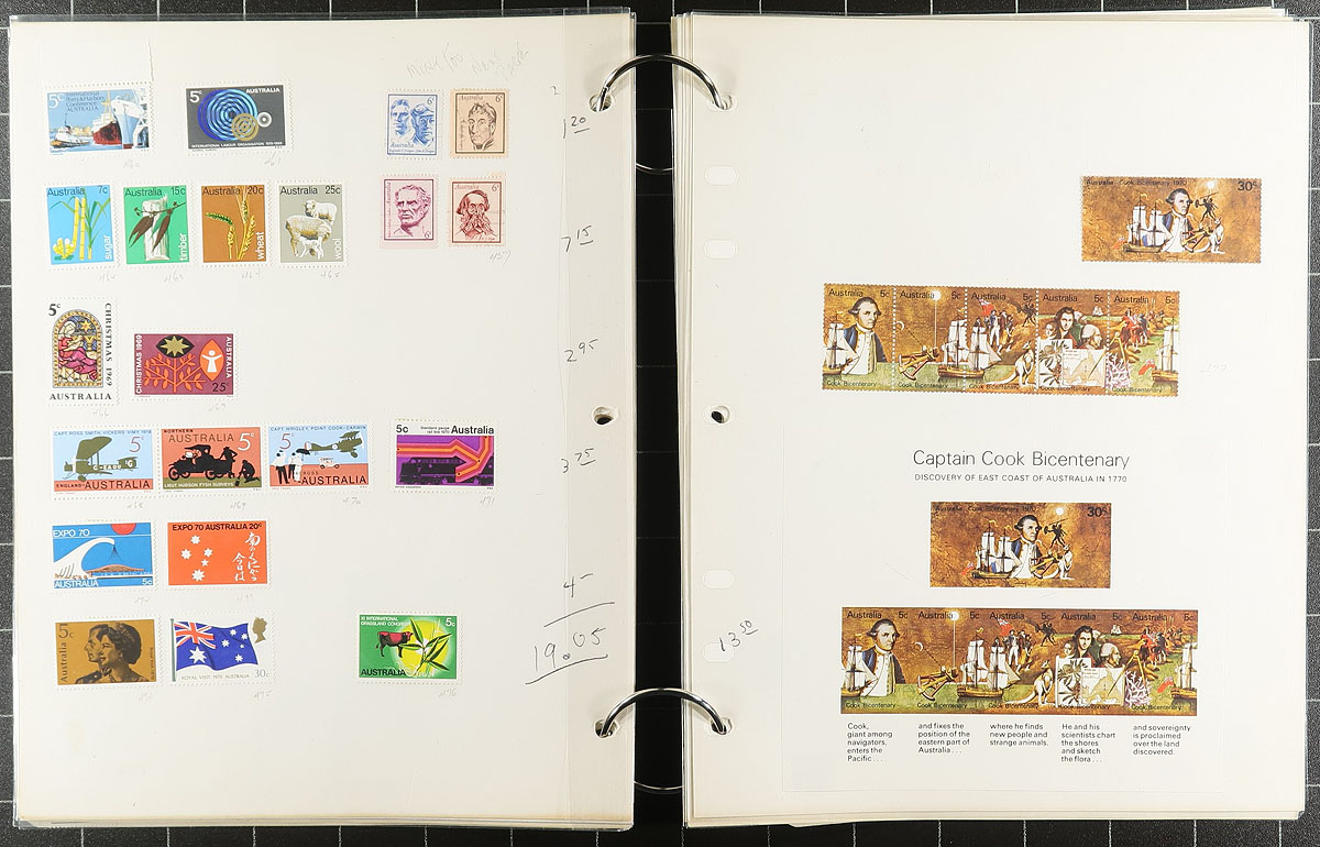 Nice collection of mint Australia, 1913-2005, containing over 1,300 stamps on many album or stock pages. The collection generally ranges from Scott #1/2641a, containing many singles, sets, blocks, and a few souvenir sheets, many hinged onto pages, along with some never hinged material. A cursory check indicated some material cataloguing $10 to $15 each. Face value alone would be several hundreds of dollars. Some duplication throughout, still a nice lot for collectors and dealers alike. Owner's older 2014 Scott US$1,447.00 =