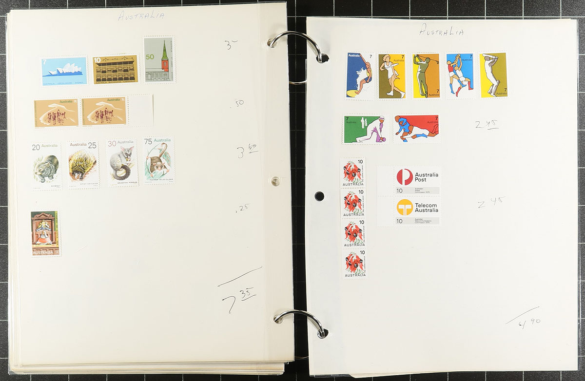 Nice collection of mint Australia, 1913-2005, containing over 1,300 stamps on many album or stock pages. The collection generally ranges from Scott #1/2641a, containing many singles, sets, blocks, and a few souvenir sheets, many hinged onto pages, along with some never hinged material. A cursory check indicated some material cataloguing $10 to $15 each. Face value alone would be several hundreds of dollars. Some duplication throughout, still a nice lot for collectors and dealers alike. Owner's older 2014 Scott US$1,447.00 =
