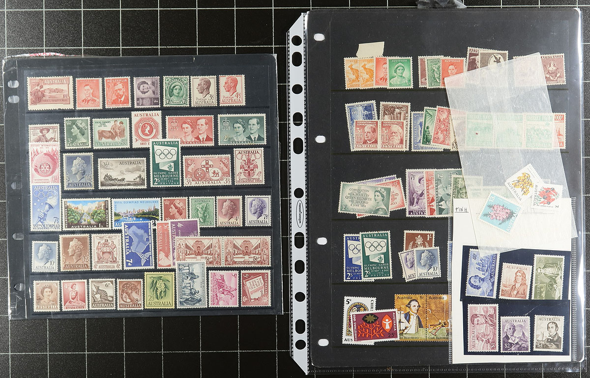 Nice collection of mint Australia, 1913-2005, containing over 1,300 stamps on many album or stock pages. The collection generally ranges from Scott #1/2641a, containing many singles, sets, blocks, and a few souvenir sheets, many hinged onto pages, along with some never hinged material. A cursory check indicated some material cataloguing $10 to $15 each. Face value alone would be several hundreds of dollars. Some duplication throughout, still a nice lot for collectors and dealers alike. Owner's older 2014 Scott US$1,447.00 =