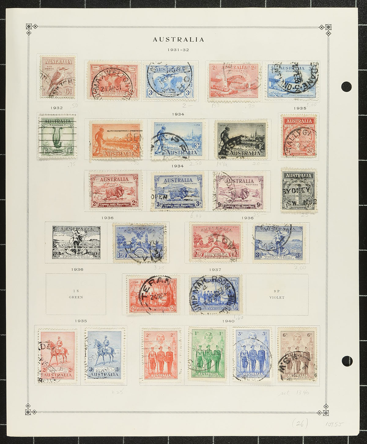 Collection / accumulation of used Australia, 1913-1998, containing over 1,000 stamps in several stock pages (loose and in a binder), along with a stockbook. The lot generally ranges from Scott #1/1630, noting a fairly good representation of Kangaroos including #s 1-3, 6-10, 39, 41-42, 47a, 54, along with selections of KGV Head issues, along with singles, sets, and partial sets cataloguing $5 to $10 and up. The lot also includes a few mint issues throughout, leaving better finds for the dedicated collector. A few small fault to be expected, overall fine to very fine. Estimate =