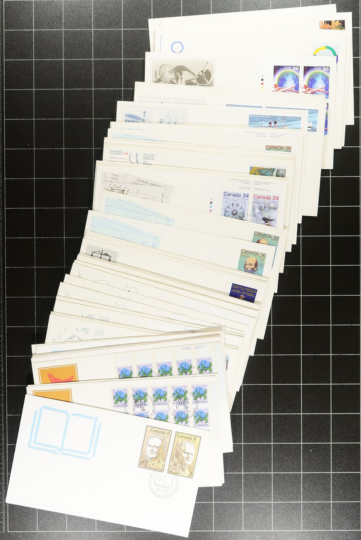 First Day Covers. Collection / accumulation of roughly 600 first day covers, 1950's-1990's, noting singles, sets, plate blocks, souvenir sheet, and high denomination frankings. Many of the early covers are uncacheted, with the more modern covers having official first day cover cachets. A nice lot, noting some covers cataloguing $5 to $10 each. Some duplication for some issues, overall fine to very fine. Estimate =