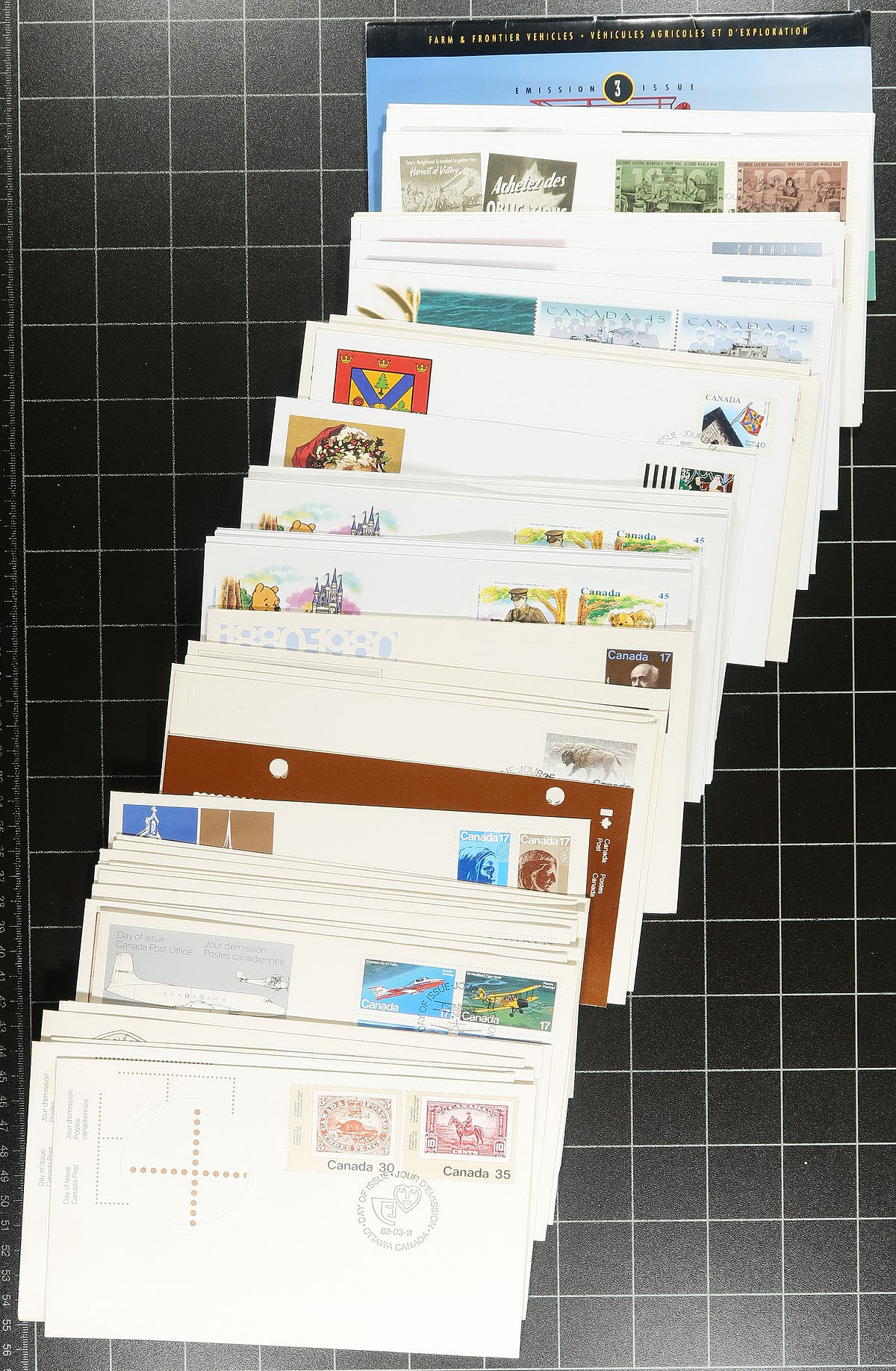First Day Covers. Collection / accumulation of roughly 600 first day covers, 1950's-1990's, noting singles, sets, plate blocks, souvenir sheet, and high denomination frankings. Many of the early covers are uncacheted, with the more modern covers having official first day cover cachets. A nice lot, noting some covers cataloguing $5 to $10 each. Some duplication for some issues, overall fine to very fine. Estimate =