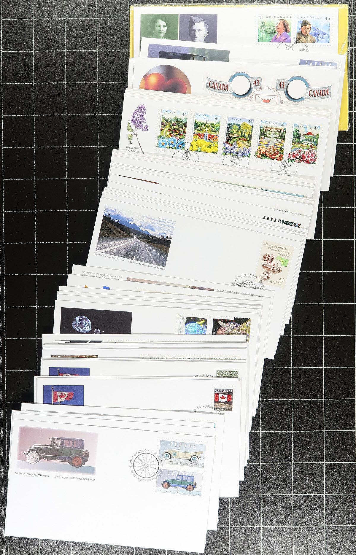 First Day Covers. Collection / accumulation of roughly 600 first day covers, 1950's-1990's, noting singles, sets, plate blocks, souvenir sheet, and high denomination frankings. Many of the early covers are uncacheted, with the more modern covers having official first day cover cachets. A nice lot, noting some covers cataloguing $5 to $10 each. Some duplication for some issues, overall fine to very fine. Estimate =