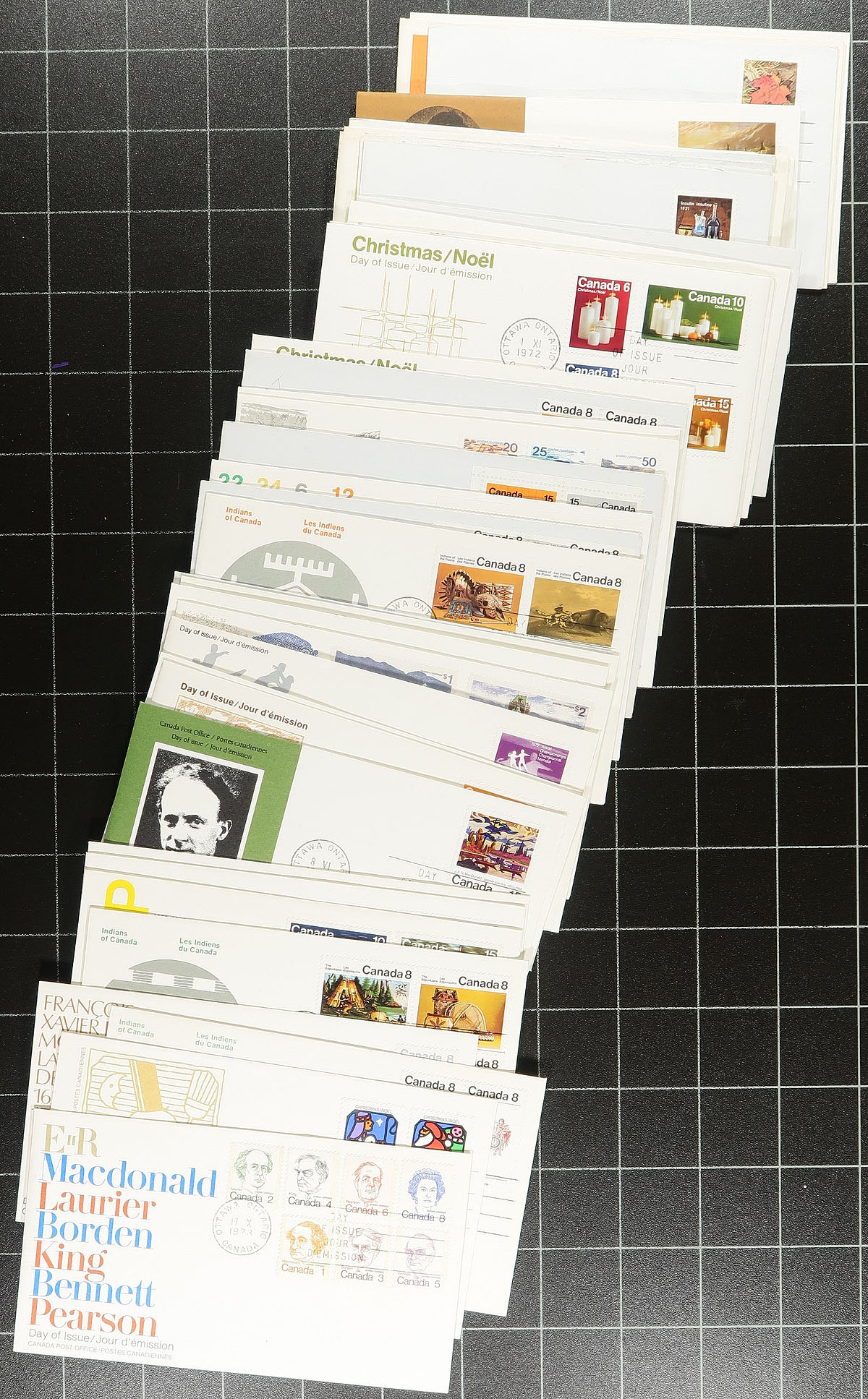 First Day Covers. Collection / accumulation of roughly 600 first day covers, 1950's-1990's, noting singles, sets, plate blocks, souvenir sheet, and high denomination frankings. Many of the early covers are uncacheted, with the more modern covers having official first day cover cachets. A nice lot, noting some covers cataloguing $5 to $10 each. Some duplication for some issues, overall fine to very fine. Estimate =