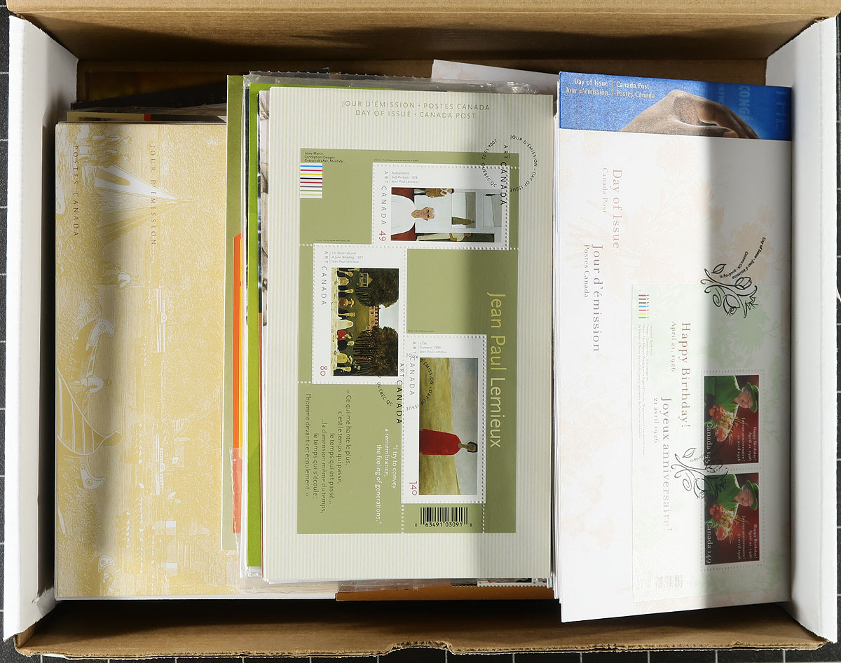 First Day Covers. Accumulation of roughly 275 modern first day covers, 2000-2010, in a box, noting singles, sets, plate blocks and souvenir sheet frankings. Some mild duplication (generally up to 3) for some issues. A nice clean lot for collectors and dealers alike. Estimate =