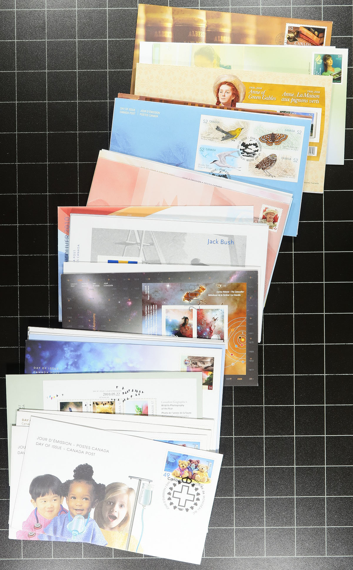 First Day Covers. Accumulation of roughly 275 modern first day covers, 2000-2010, in a box, noting singles, sets, plate blocks and souvenir sheet frankings. Some mild duplication (generally up to 3) for some issues. A nice clean lot for collectors and dealers alike. Estimate =