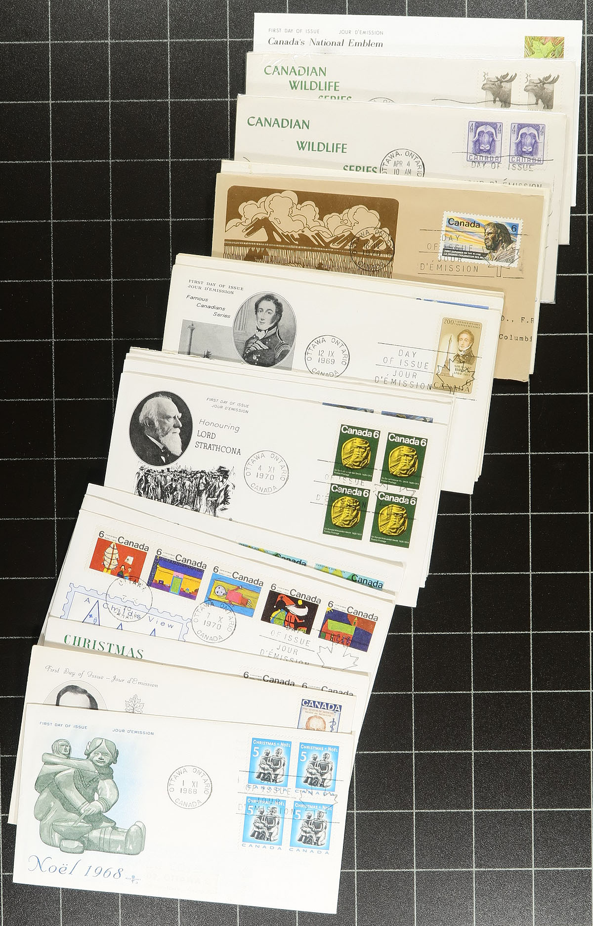 First Day Covers. Lovely group of over 500 private cachet first day covers, 1950's-1970's, noting singles, pairs, sets, and blocks, and a few plate blocks frankings. Just a few of the cachet makers include JCR, Caneco, H & E, Cole, Rosecraft, and a few more. Mild duplication through, making this a nice lot for collectors and dealers alike. Estimate =