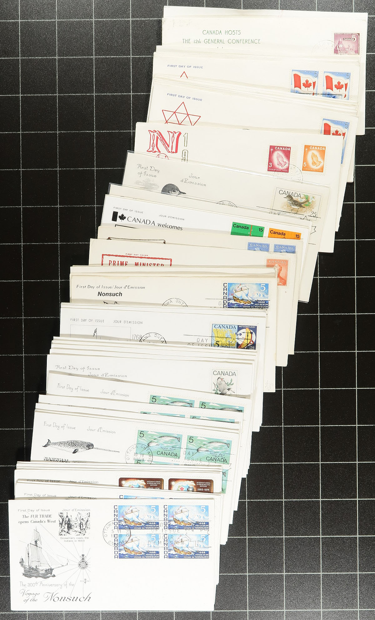 First Day Covers. Lovely group of over 500 private cachet first day covers, 1950's-1970's, noting singles, pairs, sets, and blocks, and a few plate blocks frankings. Just a few of the cachet makers include JCR, Caneco, H & E, Cole, Rosecraft, and a few more. Mild duplication through, making this a nice lot for collectors and dealers alike. Estimate =