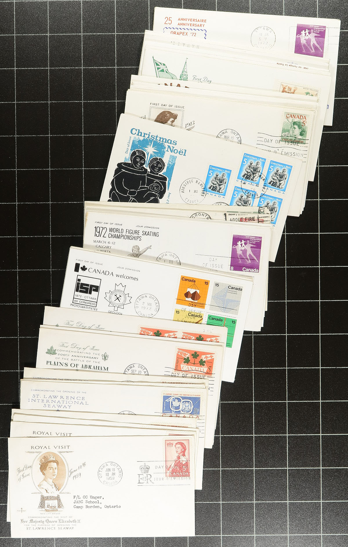 First Day Covers. Lovely group of over 500 private cachet first day covers, 1950's-1970's, noting singles, pairs, sets, and blocks, and a few plate blocks frankings. Just a few of the cachet makers include JCR, Caneco, H & E, Cole, Rosecraft, and a few more. Mild duplication through, making this a nice lot for collectors and dealers alike. Estimate =