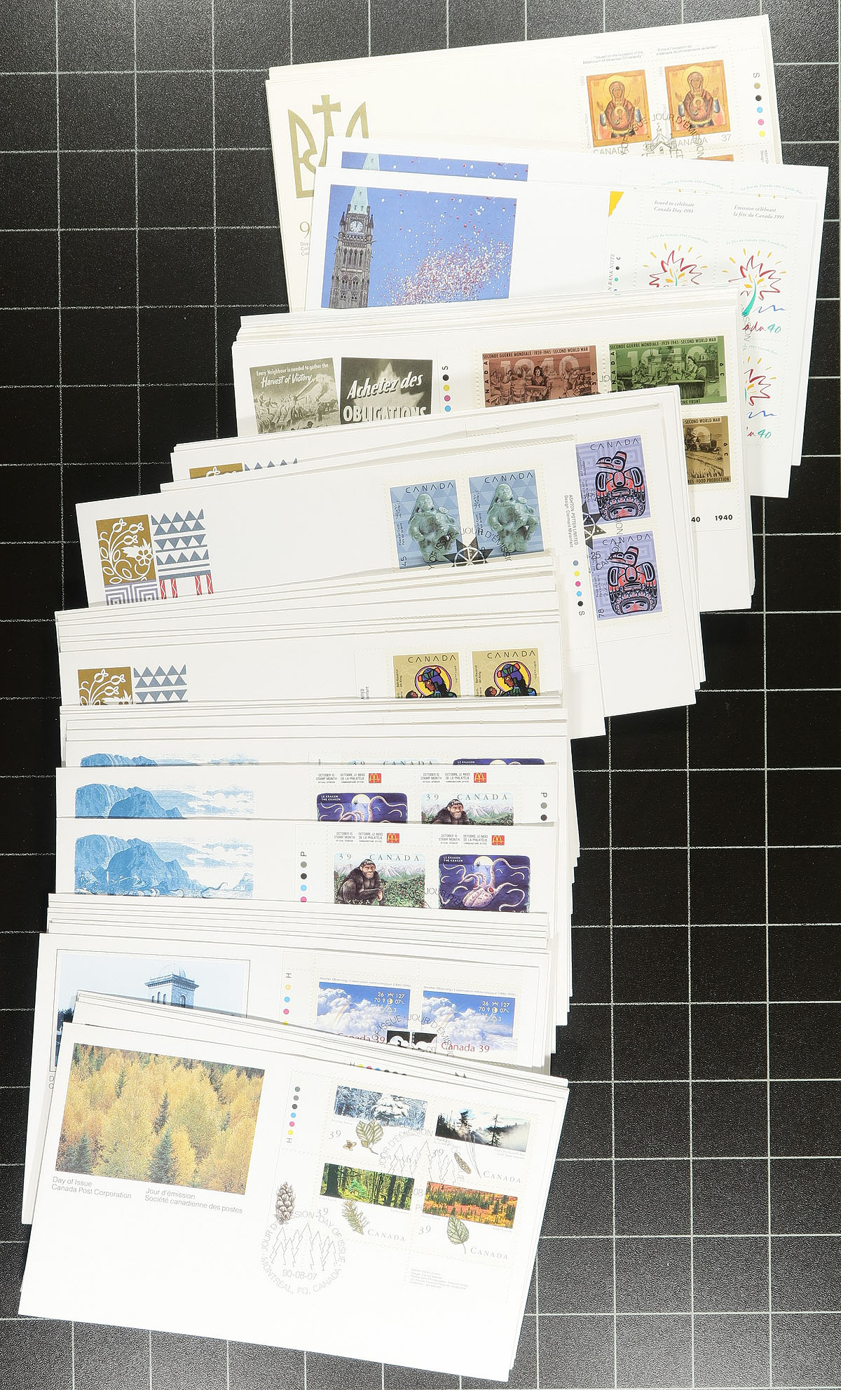First Day Covers. Nice accumulation of roughly 400 first day covers with plate block frankings, 1970's-1990's, noting a few matched sets, and high denomination frankings. Some mild duplication throughout, a nice clean lot for collectors and dealers alike. Estimate =