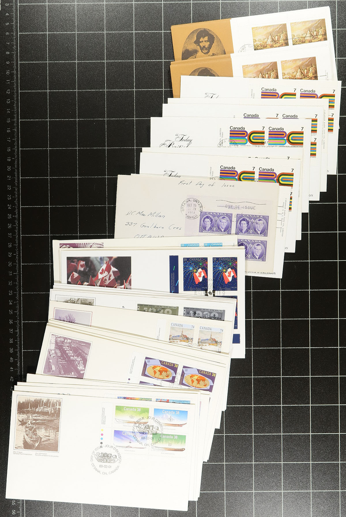 First Day Covers. Nice accumulation of roughly 400 first day covers with plate block frankings, 1970's-1990's, noting a few matched sets, and high denomination frankings. Some mild duplication throughout, a nice clean lot for collectors and dealers alike. Estimate =