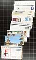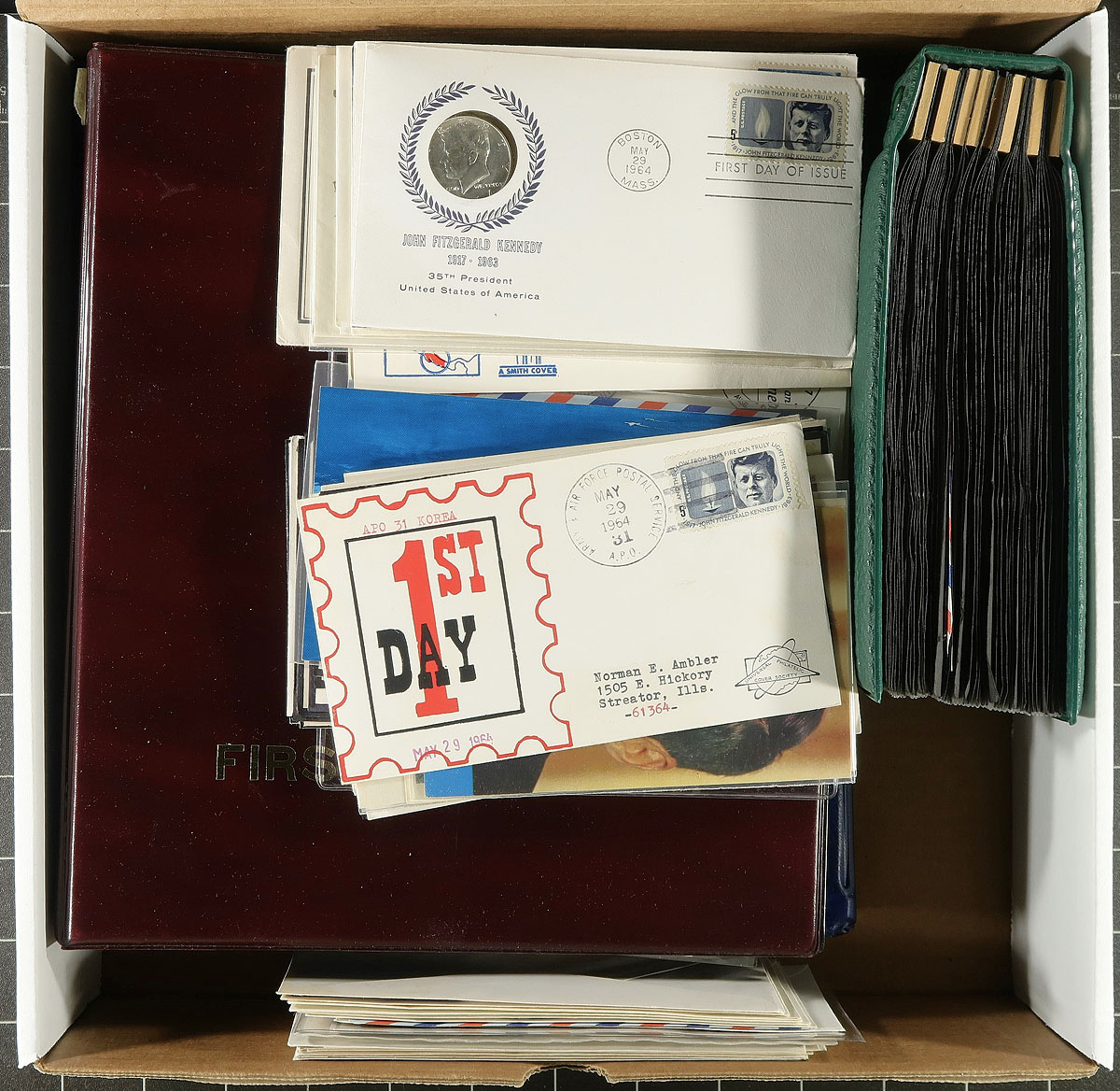 John F. Kennedy. Nice collection of roughly 300 items relating to John F. Kennedy, 1960's-1970's, in 3 albums with loose material. We note several first day covers, postal stationery, postcards, Kennedy stamp frankings, postmarks, with most of the material from the United States, but did spot some worldwide material within. A lovely topical collection from this very popular subject, only a few small faults with a few covers, overall fine to very fine. Estimate =