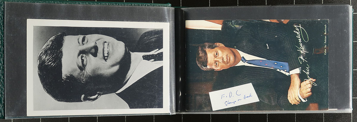 John F. Kennedy. Nice collection of roughly 300 items relating to John F. Kennedy, 1960's-1970's, in 3 albums with loose material. We note several first day covers, postal stationery, postcards, Kennedy stamp frankings, postmarks, with most of the material from the United States, but did spot some worldwide material within. A lovely topical collection from this very popular subject, only a few small faults with a few covers, overall fine to very fine. Estimate =
