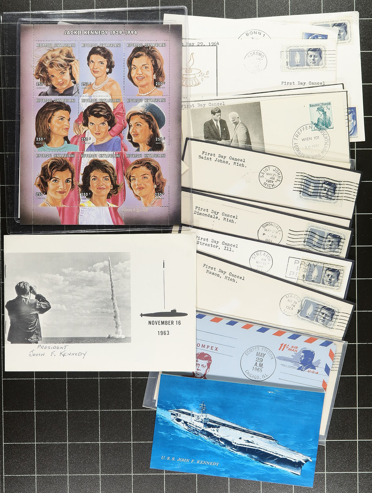 John F. Kennedy. Nice collection of roughly 300 items relating to John F. Kennedy, 1960's-1970's, in 3 albums with loose material. We note several first day covers, postal stationery, postcards, Kennedy stamp frankings, postmarks, with most of the material from the United States, but did spot some worldwide material within. A lovely topical collection from this very popular subject, only a few small faults with a few covers, overall fine to very fine. Estimate =