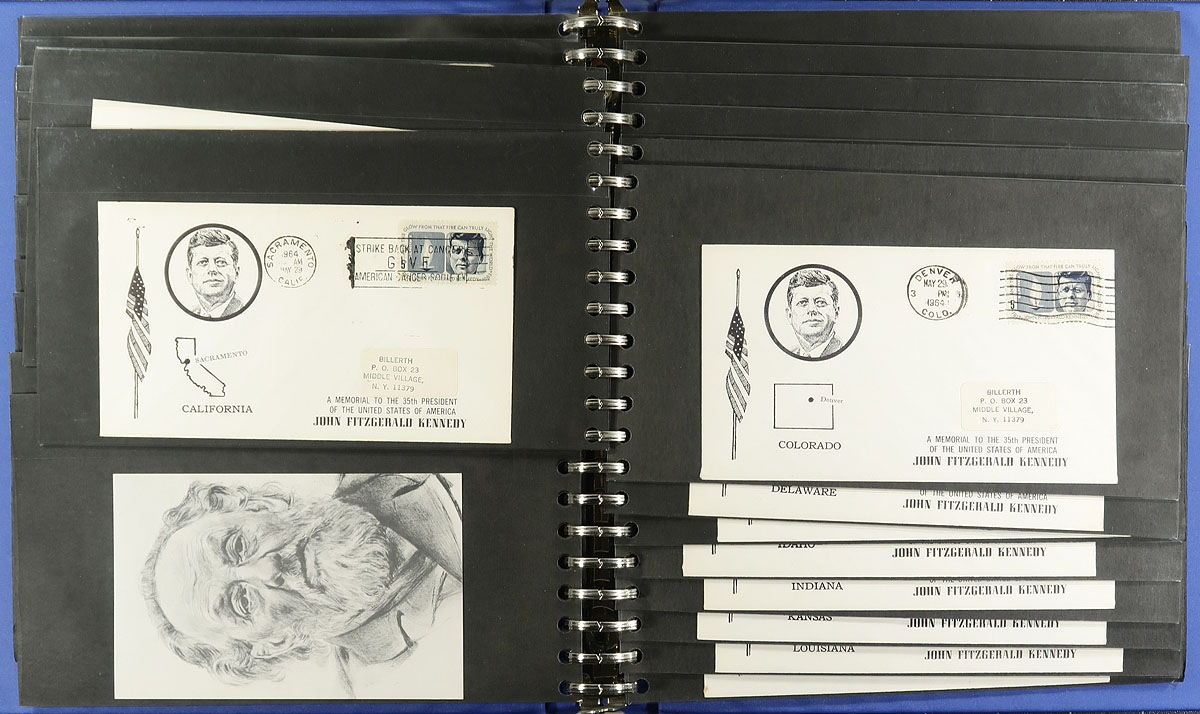 John F. Kennedy. Nice collection of roughly 300 items relating to John F. Kennedy, 1960's-1970's, in 3 albums with loose material. We note several first day covers, postal stationery, postcards, Kennedy stamp frankings, postmarks, with most of the material from the United States, but did spot some worldwide material within. A lovely topical collection from this very popular subject, only a few small faults with a few covers, overall fine to very fine. Estimate =