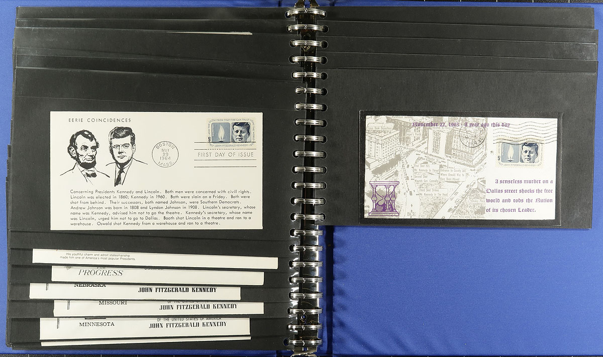 John F. Kennedy. Nice collection of roughly 300 items relating to John F. Kennedy, 1960's-1970's, in 3 albums with loose material. We note several first day covers, postal stationery, postcards, Kennedy stamp frankings, postmarks, with most of the material from the United States, but did spot some worldwide material within. A lovely topical collection from this very popular subject, only a few small faults with a few covers, overall fine to very fine. Estimate =
