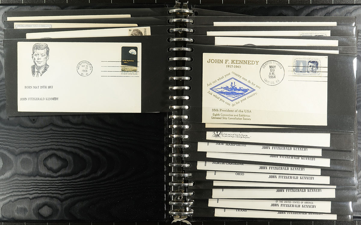 John F. Kennedy. Nice collection of roughly 300 items relating to John F. Kennedy, 1960's-1970's, in 3 albums with loose material. We note several first day covers, postal stationery, postcards, Kennedy stamp frankings, postmarks, with most of the material from the United States, but did spot some worldwide material within. A lovely topical collection from this very popular subject, only a few small faults with a few covers, overall fine to very fine. Estimate =