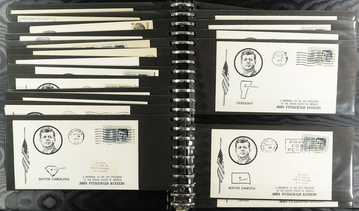 John F. Kennedy. Nice collection of roughly 300 items relating to John F. Kennedy, 1960's-1970's, in 3 albums with loose material. We note several first day covers, postal stationery, postcards, Kennedy stamp frankings, postmarks, with most of the material from the United States, but did spot some worldwide material within. A lovely topical collection from this very popular subject, only a few small faults with a few covers, overall fine to very fine. Estimate =